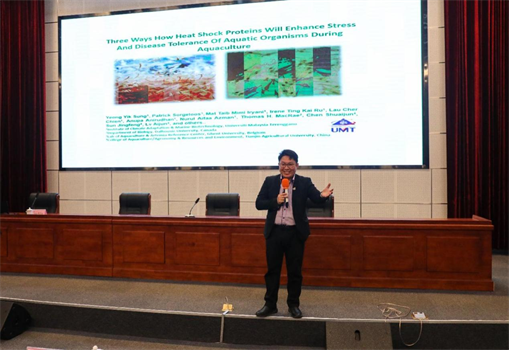 YEONG YIK SUNG教授作了题为《热休克蛋白在增强水生生物应激和疾病耐受的三种途径》的报告,会议由农学与资源环境学院谢晓东研究员主持。YEONG YIK SUNG教授深入浅出的介绍了他在热休克蛋白(HSPs)研究上的进展,包括热休克蛋白广泛存在于从细菌到人类的各种有机体中,在生物生命活动中具有重要生理功能,如热休克蛋白的表达可以提高水生生物细胞增殖和分化以及免疫应答,从而提高疾病耐受;研究热休克蛋白70的诱导因子,研究发现露兜树叶的提取物可以诱导热休克蛋白70在南美白对虾体内累积从而提高抗逆性;通过RNA干扰技术敲除热休克蛋白从而深入验证其功能。